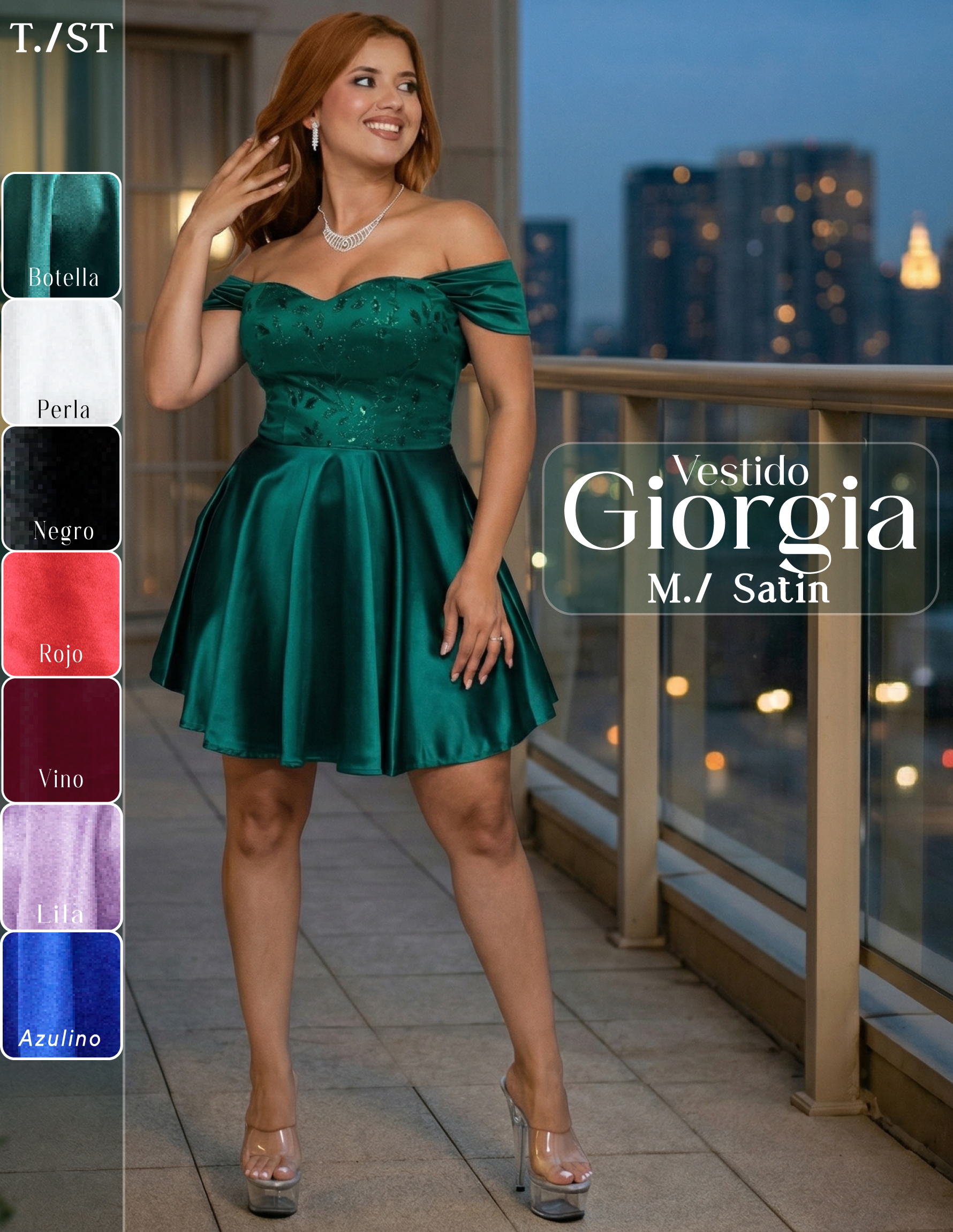 El vestido Giorgia está confeccionado en satin con detalles de tul brillante, lo que le añade un toque de glamour y sofisticación. Este diseño es ideal para eventos formales, fiestas o cualquier ocasión especial donde quieras destacar.
