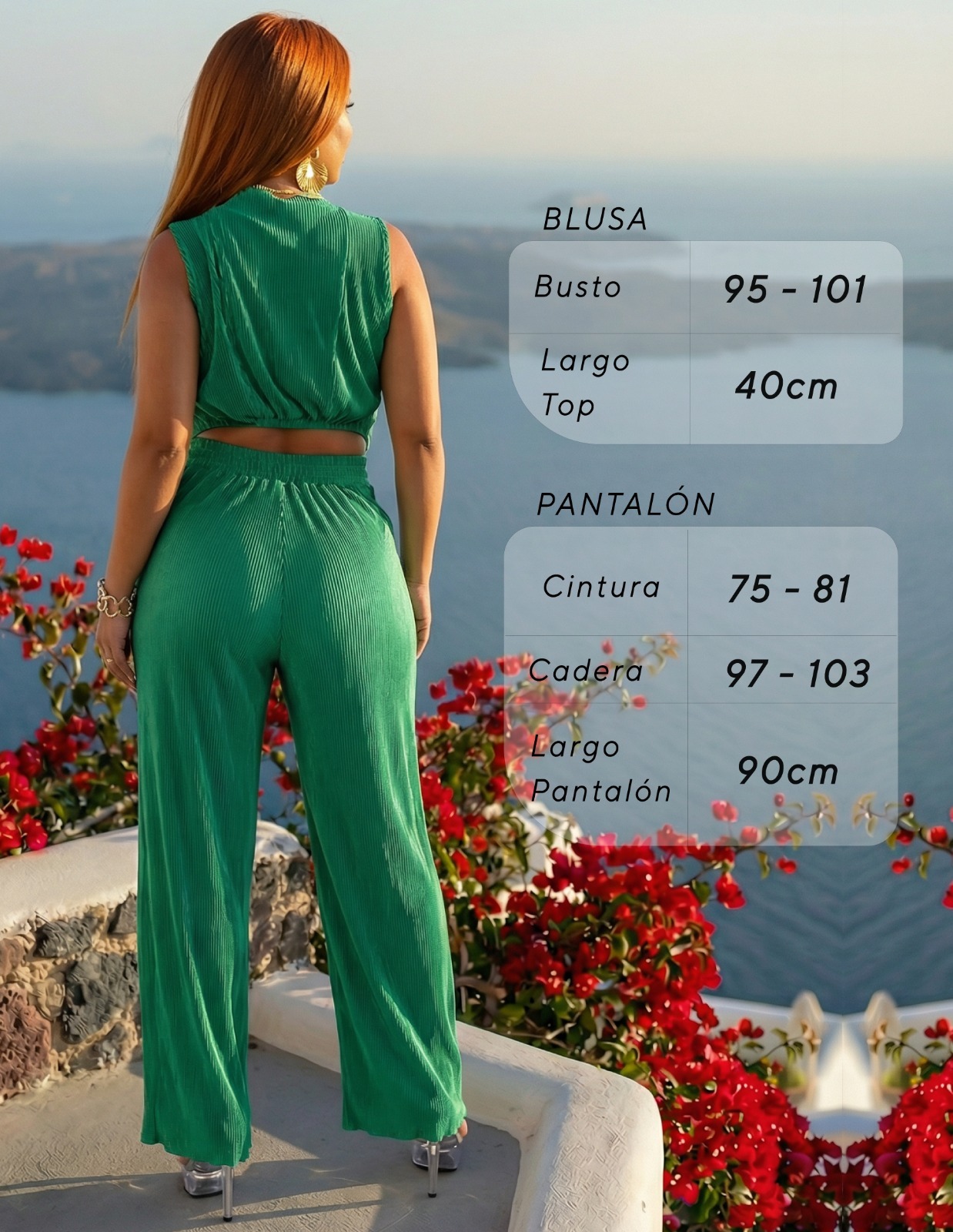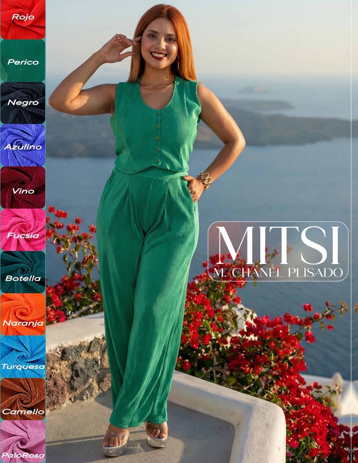 Material: Chanel plisado, un tejido ligero y con textura sutil que aporta movimiento y frescura.